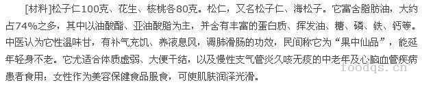 松子仁花生瘦肉汤,就是利用松子仁的可使肌肤润泽光滑的功效和富含脂肪油脂的营养成分,预防和辅助治疗皮肤干燥和由此而引发的瘙痒症。此汤中的花生仁其营养价值很高,据现代营养学分析,它所含的蛋白质仅次于大豆,且属优良的蛋白质,易为人体所消化吸收,所含脂肪量却为大豆的2倍,还含大量的碳水化合物、多种维生素、卵磷脂以及钙、铁等20多种微量元素。此汤正是利用其蛋白质和脂肪量特别多的含量,同时中医还认为,它性平味甘,能补气、润肺、健脾、开胃。同样是药食兼之的核桃,中医认为它性温味甘补肾固精、温肺止咳,益气养血,补脑益智、润肠通便,冬日用之对皮肤调养十分理想。合而为甜羹,清润可口,能养液息风,滋润肌肤、健肾养肺,且男女老少皆宜。【