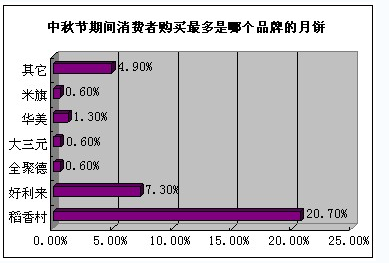 在36.0%能够记住自己购买过月饼品牌的消费者中,稻香村月饼的消费者购买比率最高,占20.7%;其次是好利来品牌的月饼,占消费者选择比率的7.3%。华美、全聚德、大三元和米旗这些知名品牌的消费者购买比率或品牌记忆度都非常低,分别只有1.3%和0.6%;其它月饼品牌的消费者购买比率合计只有4.9%。可见多数消费者实际购买的并不是自己最喜欢的或知名度很高的月饼品牌。
