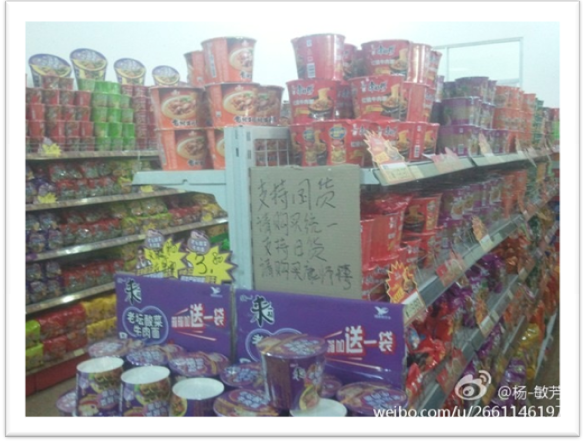 厮杀战场开始蔓延到谣言攻击上。2012年9月,网上开始大量流传康师傅为日资企业的谣言,且在店内张贴海报,指康师傅是日资企业煽动消费者拒买其产品,杀伤力之强甚至一度造成康师傅业绩下滑。虽然幕后推手没有最终定论,后续康师傅起诉湖北孝感统一的员工周某,最终胜诉,期间周某承认利用微信朋友圈转帖是公司安排。这一系列事件皆为商业恶意竞争的手段。