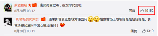 陈一冰、史冬鹏等是面馆常客,而郎平在女排决赛前“背着队员”偷偷煮面的视频,犹如扔到微博的一枚炸弹,万名网友集赞呼吁“康师傅签约女排”。