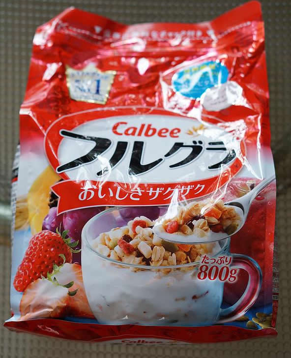 日本 卡乐比calbee水果颗粒谷仁麦片800g 即食麦片 营养早餐,各种水果谷物的图片在照片上清晰可见,让人一看就有想吃的冲动,日本卡乐比有很方便的自封条,保存非常方便,泡水后色泽金黄润泽,果干颗粒较少。吃起来一入口就有比较浓郁的椰子香味和奶香味,嚼起来的感觉很像小小的爆米花,香香甜甜,虽然果干不是很丰富。