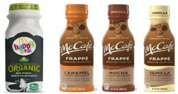 Arla和麦当劳已经合作了30年,自2007年以来,Arla一直在为麦当劳提供有机牛奶作为茶、咖啡等产品配料。上个月,Arla宣布扩大与麦当劳的合作伙伴关系,在英国麦当劳餐厅推出新的联合品牌Happy Meal瓶装有机牛奶。这款产品采用250ml瓶装,黑色的标签上搭配麦当劳标志性的金拱门和Arla的Logo,设计时尚大气。除了将在英国开卖有机牛奶之外,近日麦当劳也宣布与可口可乐合作,将于2018 年年初在美国推出瓶装版的麦当劳冰咖啡(McCafé Frappé),口味有三种:焦糖、香草和摩卡。