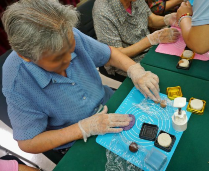 老人们按照这个方法边学边做,他们像老小孩儿一样专注细心地模仿每个动作。第一位完成的张奶奶熟练的把面皮搓圆后摊平,把馅儿放在中间,以食指和拇指的力量慢慢向上收口,放入模具时按压的力度刚刚好。还热情地帮助身边其他老人,传授她的经验。她说到“自己年轻时每逢过节都会做粽子、汤圆等点心,还会做豆沙、芝麻馅料。今天首次做月饼非常开心,我要拿回去给孙子看看奶奶亲手做的月饼。”
