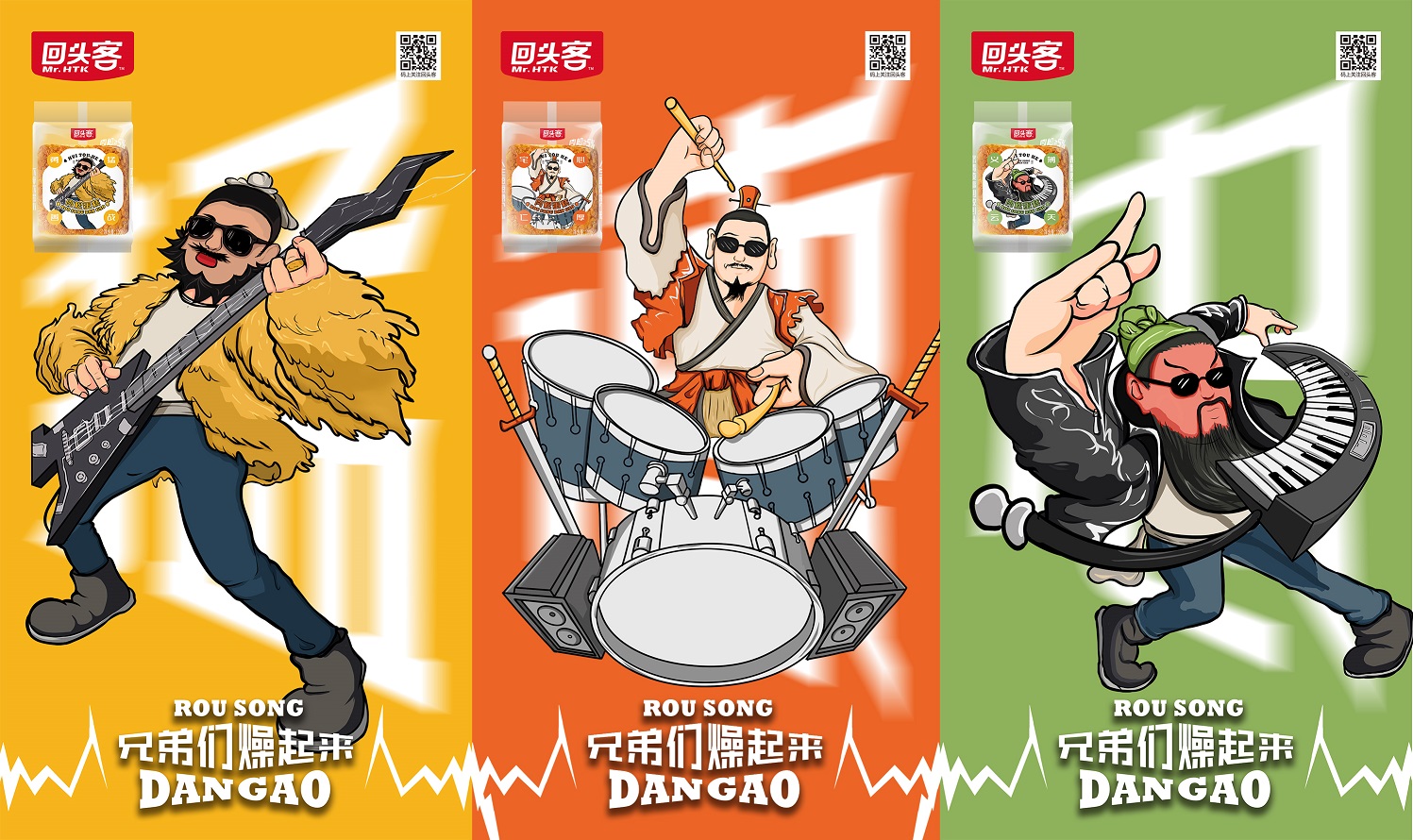 回头客肉松蛋糕与另一大IP“三国演义”进行结合,选取刘备、关羽、张飞等英雄形象,提炼其人格品质,如:关羽的义薄云天,张飞的勇猛善战,刘备的宅心仁厚与“兄弟们燥起来”、“人生短短急个球”等现代摇滚风格的文案结合,今古融合,形成认知反转,创意十足。