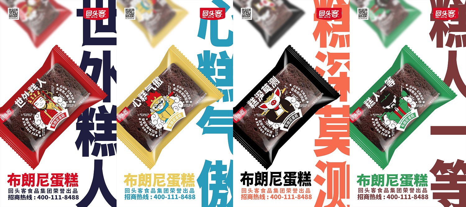 回头客布朗尼蛋糕与西游记系列IP联合,通过代表人物唐僧、孙悟空、猪八戒、沙僧的招牌形象,挖掘其潜在另类的心理特点,对传统形象进行全新的解读。例如,对猪八戒的人物描述为高深莫测,在包装呈现上,则将“糕”与“高”巧妙结合,用“糕深莫测”配以“虽然我长得肥,但我想的美”的趣味文案。此外,孙悟空被定义为心“糕”气傲,沙僧为“糕”人一等,唐僧为世外“糕”人,并分别配以有趣的解读文案,让人眼前一亮,辨识度极高。