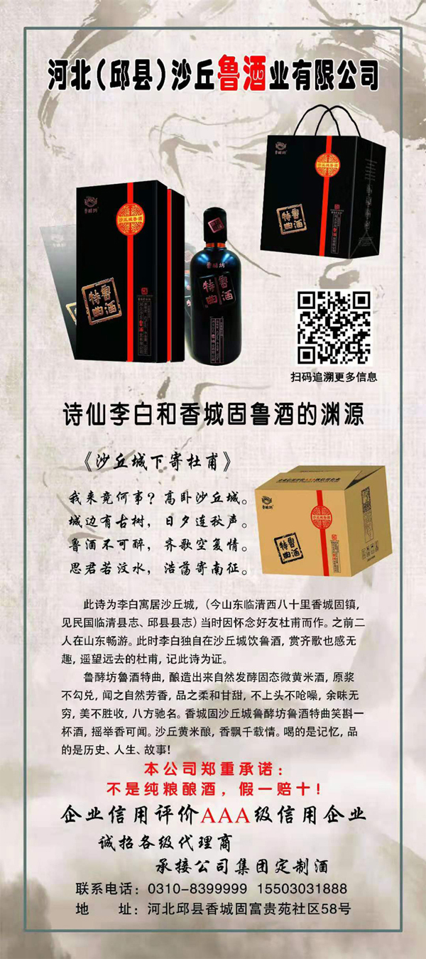 当今的邯郸鲁酒又是笑斟一杯酒,摇举香可闻。沙丘黄米酿,香飘千载情。喝的是记忆 ,品的是历史、人生、故事!李白有一首诗,叫沙丘城下寄杜甫。