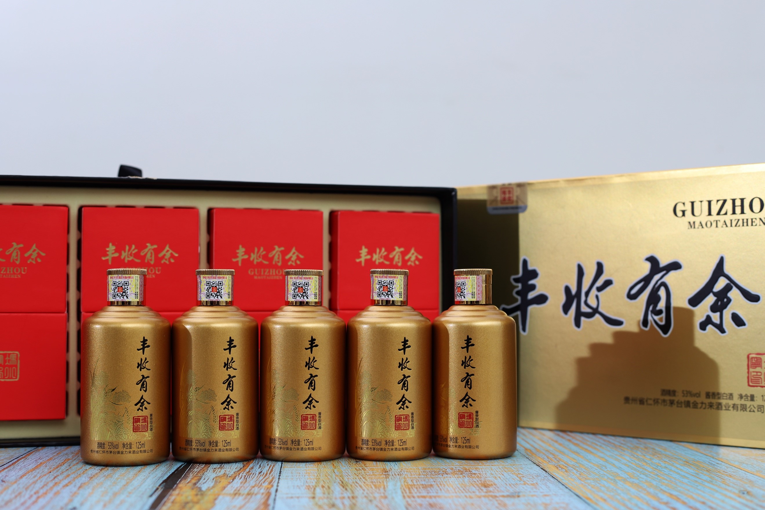 在生产工艺上秉承茅台酱香型白酒的传统工艺,原材料完全采用贵州黔南向阳坡地生长的红樱子高粱,历经九次蒸酿,八次发酵,七次取酒,历端午踩曲,重阳投料等二十四节气一千多个日夜,成就了每一瓶丰收有余酱香酒的品质。坚持“高温制曲、高温馏酒、高温堆积(发酵)、长期储存、精心勾兑”的酿酒工艺,将原生态的酱香型白酒发挥到极致。入口,酱味纯正,唇齿生香;入喉,清冽润滑,如绢丝下行;入腹,则温胃行气,余味绵延……饮后,空杯留香持久。