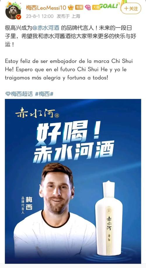 8月1日,“球王”梅西通过个人官方微博宣布了一则代言,称很高兴成为赤水河酒的品牌代言人,未来的一段日子里,希望能和赤水河酱酒给大家带来更多快乐与好运。