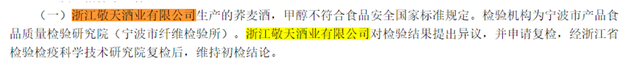 对上述抽检结果,浙江敬天酒业提出异议,并申请复检,经浙江省检验检疫科学技术研究院复检后,维持初检结论。