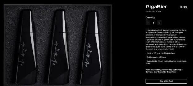 此前,特斯拉在欧洲市场推出一款皮尔斯纳风格啤酒 GigaBier ,3 瓶售价 89 欧元,也就是 668 元人民币,一瓶 200 多块,官方透露,这款酒 330ml,酒精含量 5%,还是限量版,每个人最多可订购 3 瓶。