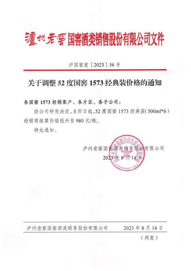泸州老窖旗下国窖1573提价20元/瓶,经销商结算价980元/瓶