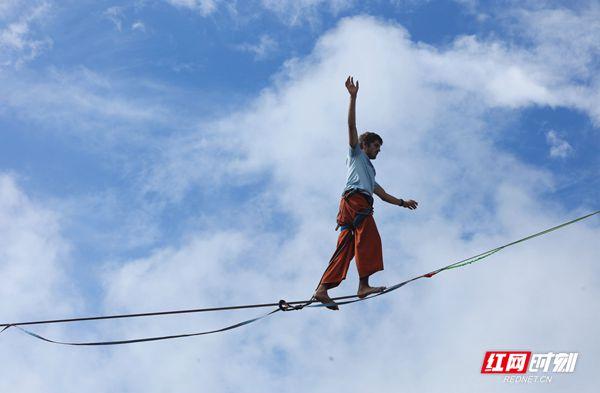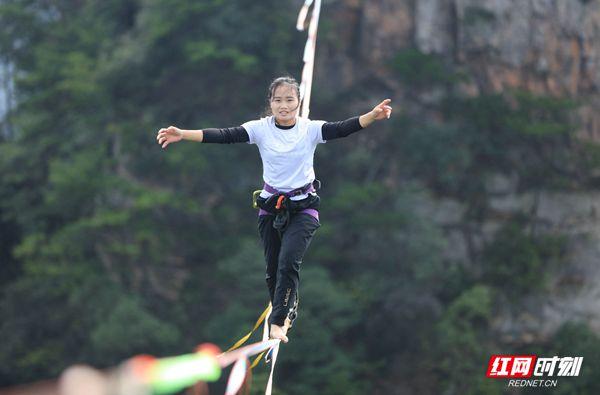 选手要在120米长、2.5厘米宽、2毫米厚的扁带上保持身体平衡,完成行走。