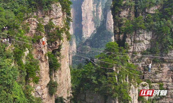 不上黄石寨,枉到张家界。自2018年以来,在黄石寨峰巅连续举办惊险刺激的高空扁带对抗赛,吸引国内外众多扁带爱好者一决高下,让张家界地貌神奇风光通过这种集竞技性、时尚性和艺术性于一体的极限运动展现给世界。黄石寨扁带赛已成为张家界“旅游+体育”又一张响亮名片。