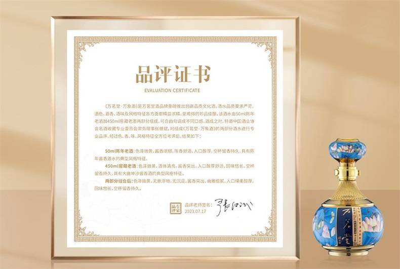 万茗堂•万象酒在酒成之时,力邀中国酒业协会名酒收藏专业委员会常务理事、兼职副秘书长、江苏省收藏家协会酒类收藏专业委员会会长、老酒收藏专家张继斌进行专业勾调和品评,给予:“酒色微黄,一看就是经年累月的老酒,酱香很浓郁,芳香力度也很强,闻香之后能感受到15年以上老酒的那种穿透力”的高度评价,并为其出具品评证书。