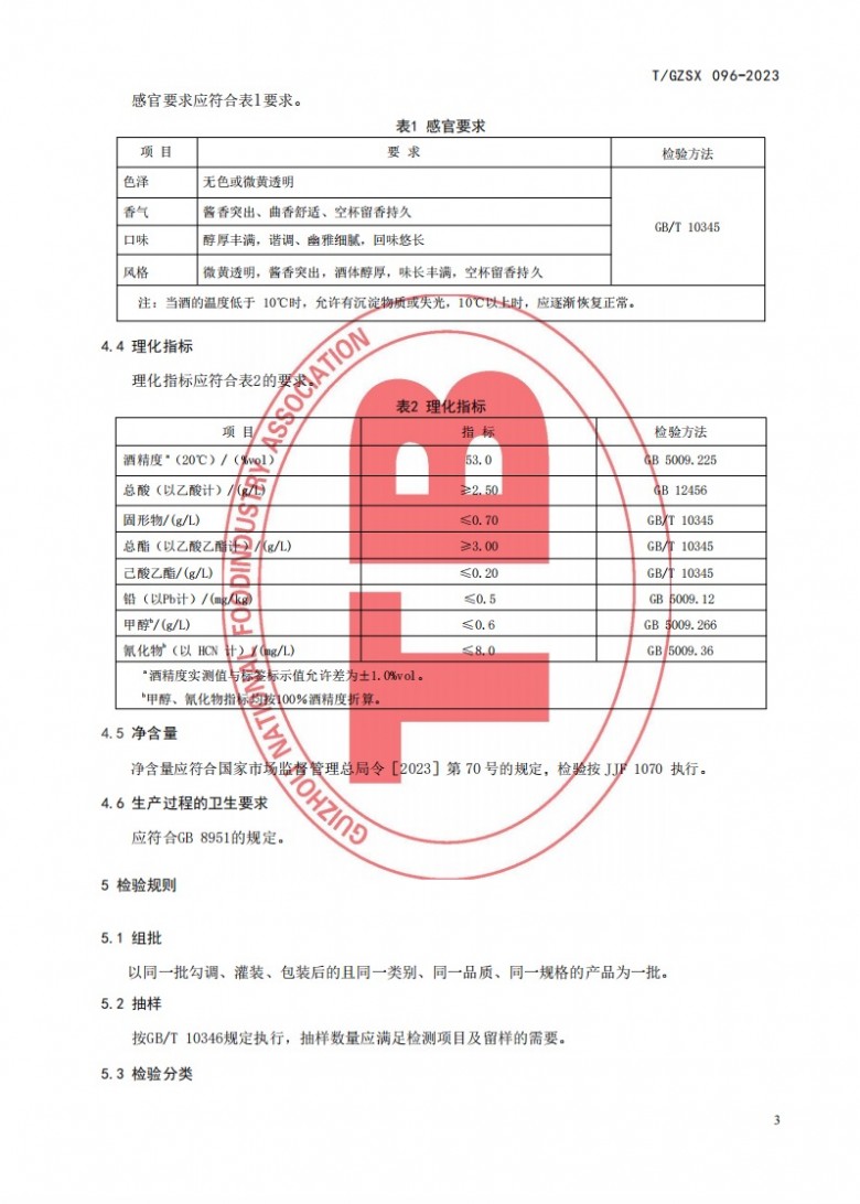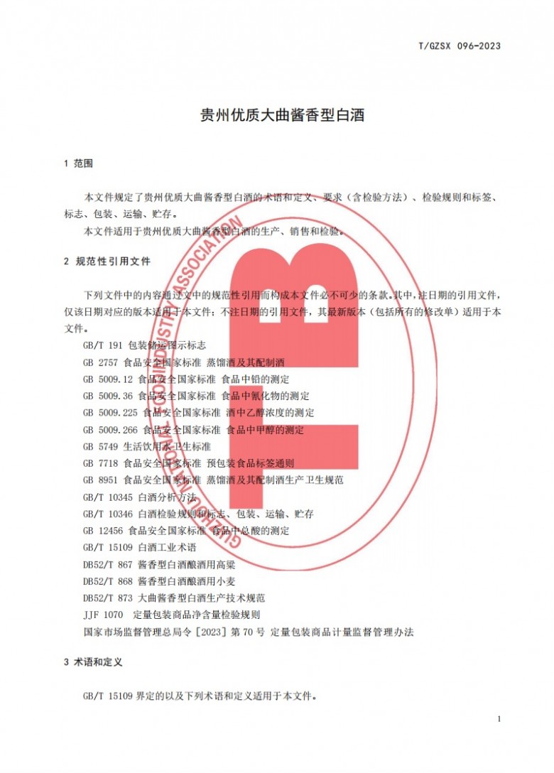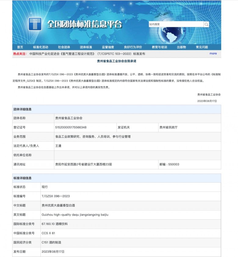 据全国团体标准信息平台网站显示,由中国食品工业协会发布的《贵州优质大曲酱香型白酒》全国团体标准(标准编号T/GZSX 096-2023)于2023年8月17日正式发布,2023年9月1日正式实施。