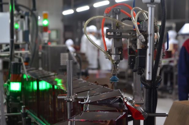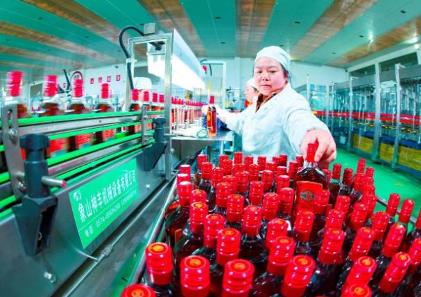 在劲牌酒厂包装车间,放眼所见的是自动化生产线,一瓶瓶中国劲酒在线上流动,从灌装入瓶到包装入箱,一眼可以看到全流程。