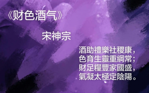 第三种理解,是宋神宗的生生之道,神宗认为“酒助礼乐社稷康,色育生灵重纲常。财足粮丰家国盛,气凝太极定阴阳。”