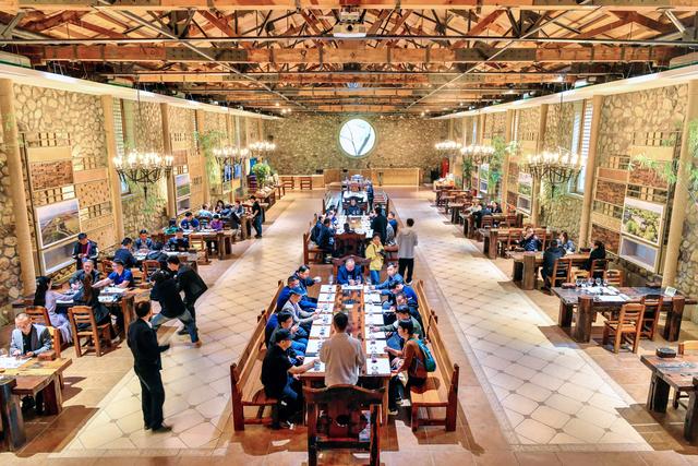 酒庄建筑主体就地取材,采用近2万吨戈壁滩上的鹅卵石建设。没有高屋楼宇,只有石墙与林木,低调古朴的中式建筑,结合中国传统的石雕、青砖、青瓦点缀,仿佛天然形成的景观。