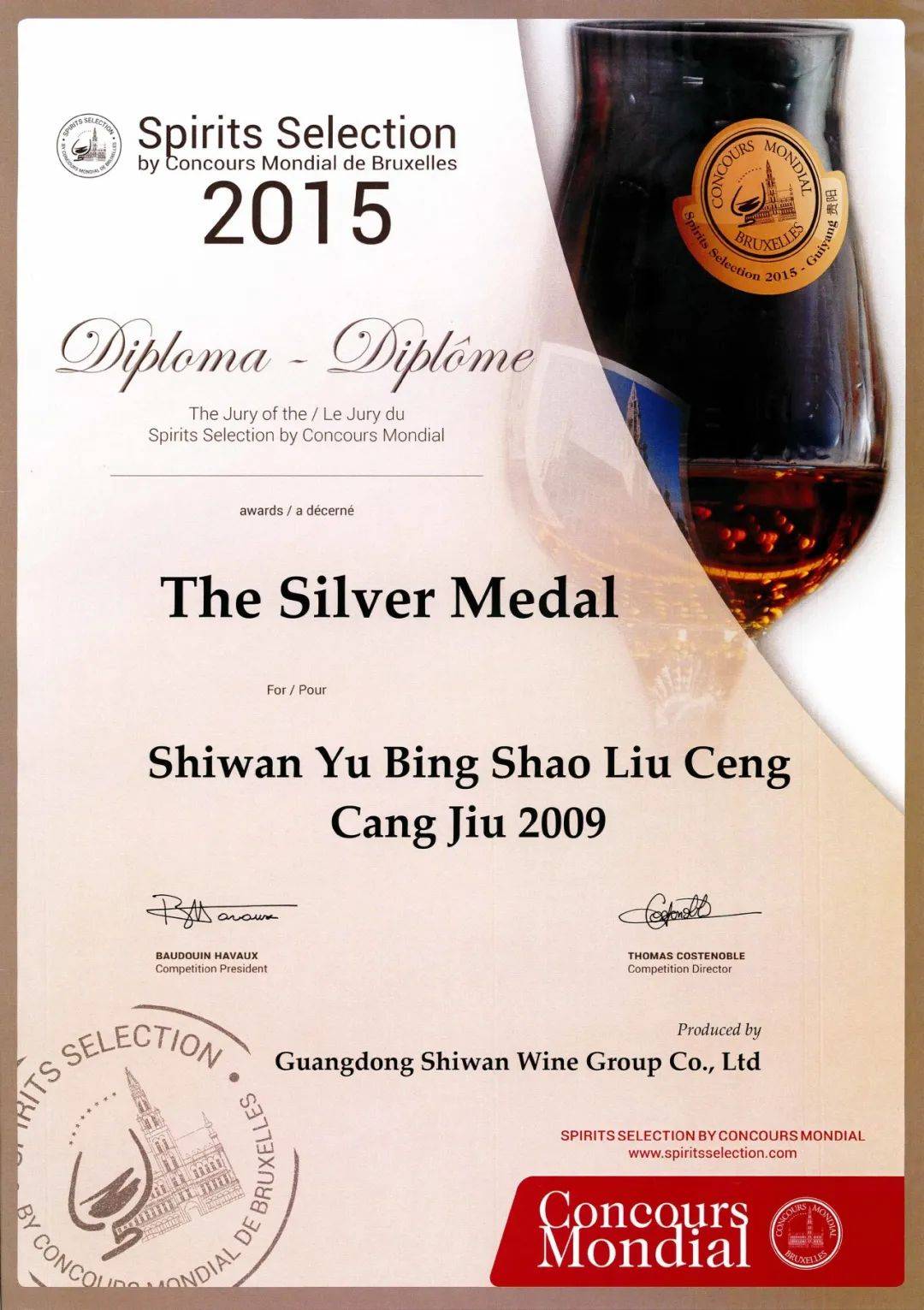 ▲“石湾玉冰烧·六埕藏酒”荣获2015比利时布鲁塞尔国际烈性酒大奖赛银奖荣誉。
