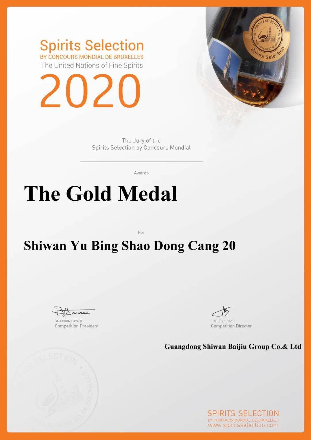 ▲“石湾玉冰烧·洞藏二十”荣获2020比利时布鲁塞尔国际烈性酒大奖赛金奖荣誉。