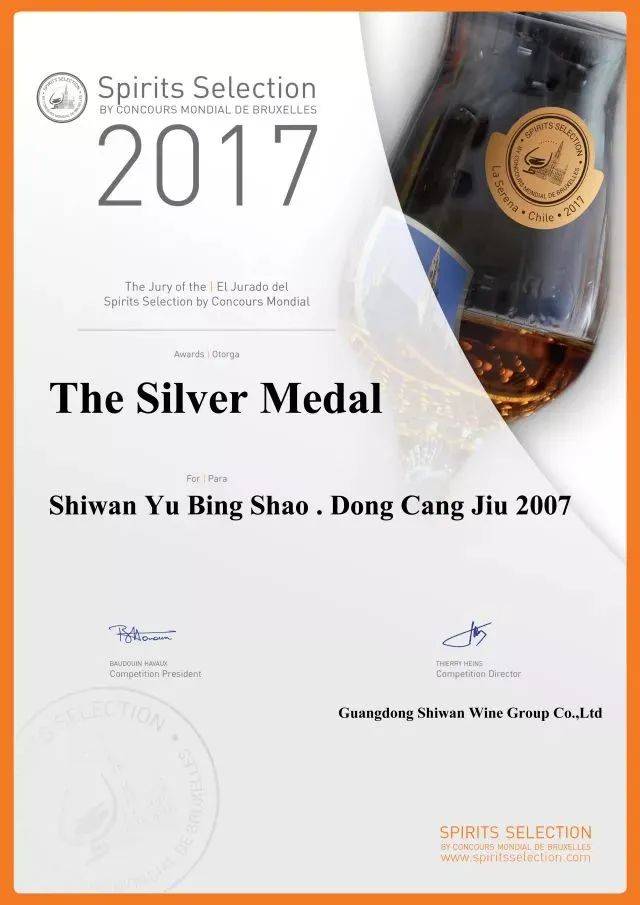 ▲“石湾玉冰烧·洞藏九”荣获2017比利时布鲁塞尔国际烈性酒大奖赛银奖荣誉。