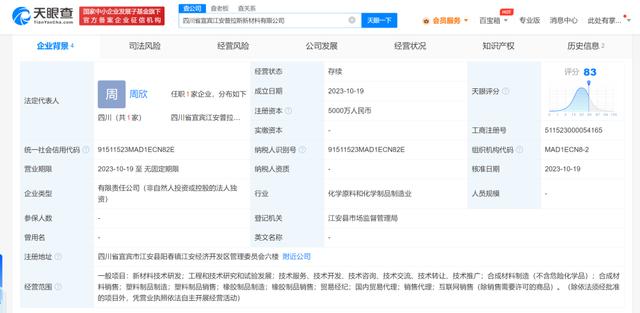 近日,记者从天眼查App获悉,四川省宜宾江安普拉斯新材料有限公司成立,法定代表人为周欣,注册资本5000万人民币,经营范围含新材料技术研发、工程和技术研究和试验发展、塑料制品制造、塑料制品销售、橡胶制品制造、橡胶制品销售等。