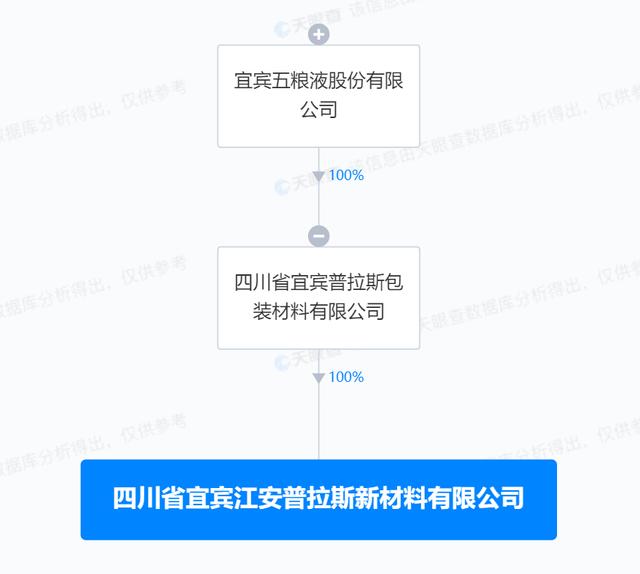 股权全景穿透图显示,该公司由四川省宜宾普拉斯包装材料有限公司全资持股,后者为五粮液(000858)全资子公司。