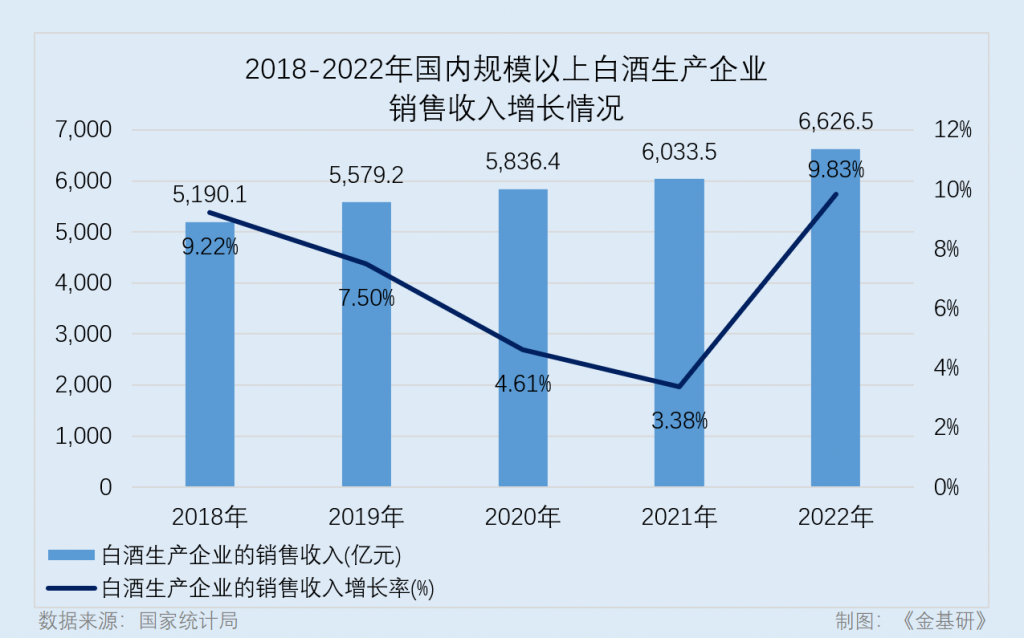数据显示,2018-2022年,国内规模以上白酒生产企业的销售收入分别为5,190.1亿元、5,579.2亿元、5,836.4亿元、6,033.5亿元、6,626.5亿元,2022年规模以上白酒生产企业的销售收入较同期增长9.83%。