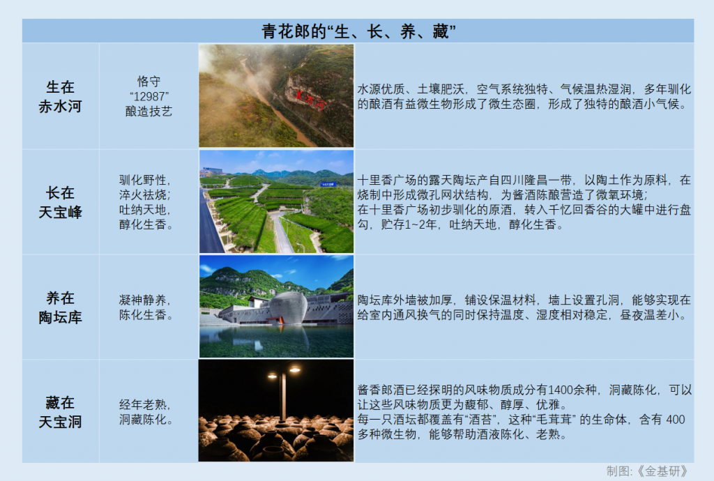 在赤水河边酿造、在天宝峰上成长、在陶坛库里静养、在天宝洞中修炼洞藏,以特级酒为体,以20年以上陈年酒及调味酒为魂,青花郎酱香突出、幽雅细腻、酒体醇厚,具有行业最好的回味。