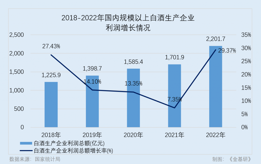 从利润的角度看,2018-2021年,国内规模以上白酒生产企业的利润分别为1,225.9亿元、1,398.7亿元、1,585.4亿元、1,701.9亿元、2,201.7亿元,2022年规模以上白酒生产企业的利润较2021年增长29.37%。