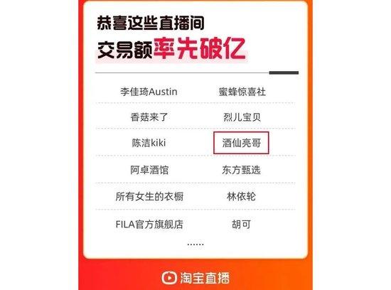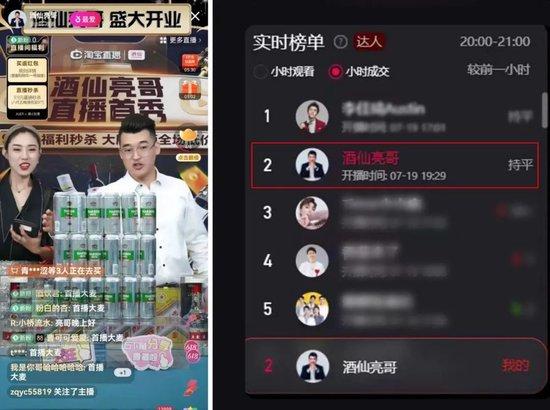 6月的“淘宝天猫首届酒水直播节”,酒仙亮哥首次亮相,销售额就有1443万元,直播间人气最高时,冲到第二名,排在李佳琦后面。