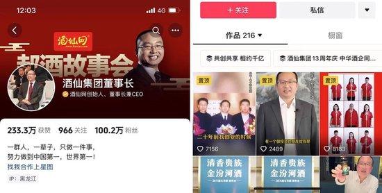 郝鸿峰也亲自下场,其抖音账号为“酒仙集团董事长”,粉丝量超百万。