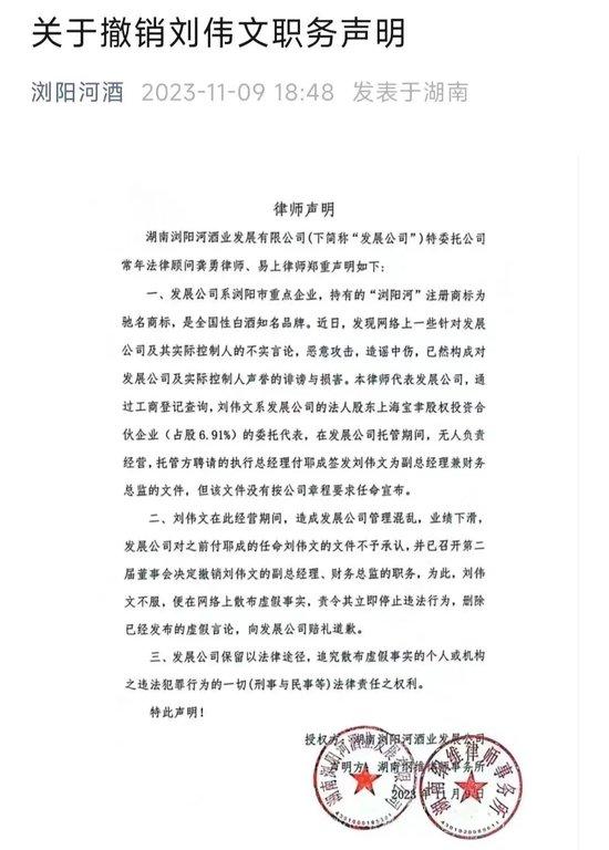 但同样认证为浏阳河酒的官方公号和官方微博则发布了“撤销刘伟文职务”的声明,称“刘伟文在经营期间,造成发展公司管理混乱,业绩下滑,发展公司对之前付耶成的任命刘伟文的文件不予承认,并已召开第二届董事会决定撤销刘伟文的副总经理、财务总监的职务。为此,刘伟文不服,便在网络上散布虚假事实,责令其立即停止违法行为,删除已经发布的虚假言论,向发展公司赔礼道歉。”这篇撤职声明同样刊登在了《湖南日报》上。