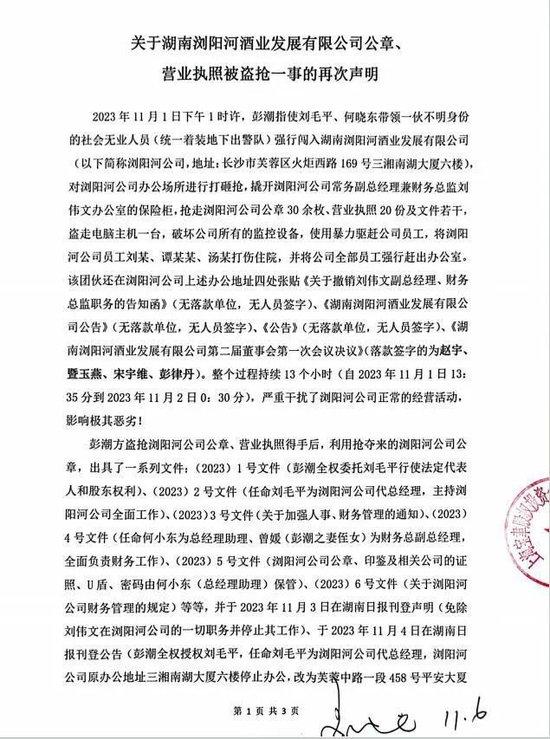 公告称,本月初,彭潮指使30余人强闯浏阳河酒办公所在地,撬开了刘伟文的保险柜,抢走公司公章和营业执照,搬走电脑主机,打伤公司员工。公告还称,彭潮只是公司表象上的大股东,实际已完全丧失其公司股东身份和股权权利。