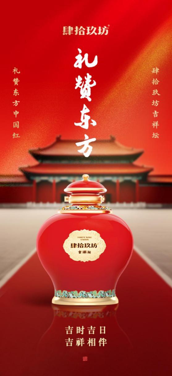 肆拾玖坊吉祥坛以经典的中国红为主,创意来自故宫明清时代经典的八宝如意将军罐,再加上其形体敦厚,看起来就像一个威武霸气的大将军。吉祥坛的中国红象征着最具生命力的颜色,吉庆祥和,温暖激情,红色有着大气和包容的含义,也能够展现中庸之道的大国风骨,是代表中国人的文化图腾。而且吉祥坛的瓶身材质选用的是景德镇的上等材料,其外包装盒子采用红色特种肌理材质,工艺精湛,可以说能够达到奢侈品的级别。
