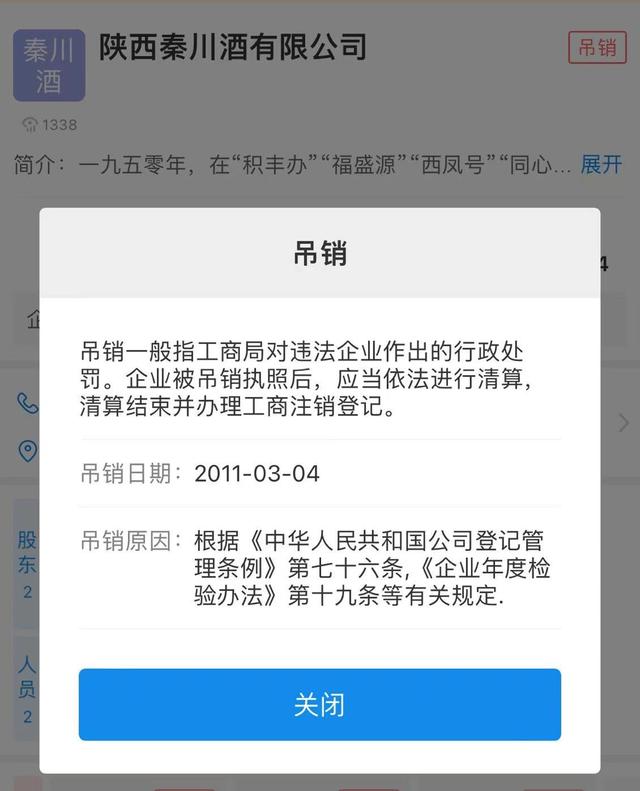 查阅发现,当时申请“中华老字号”的主体陕西秦川酒有限公司早在2011年3月4日,也就是刚获得认定后不久就被吊销执照,此后也再未变更“中华老字号”企业名称。