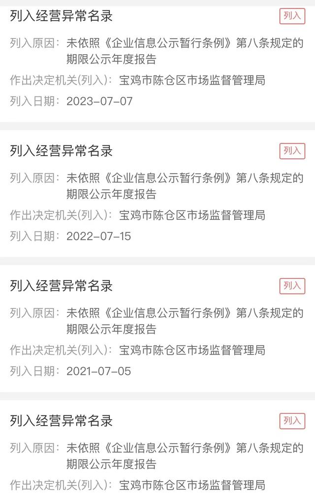 值得关注的一点是,宝鸡秦酒的法定代表人为张斌,该企业发起股东中,除黄川会、梁国模等自然人外,另有437名股东共同认缴出资219.7万元,持股比例为82.2846%,不排除是此前解散酒厂员工共同出资成立。虽然该公司当下未注销,但连续多年显示经营异常。