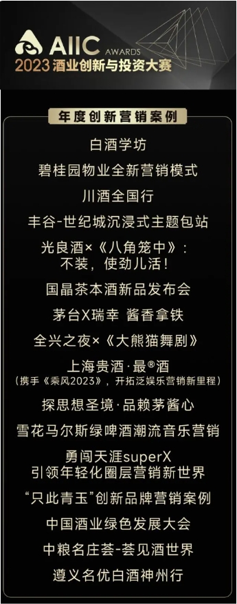 2023年11月19日,在“大变局:突围与新生”AIIC 2023酒业创新与投资大会上,赖茅品牌活动”探思想圣境·品赖茅酱心"荣获由2023酒业创新与投资大赛(AIIC Awards) 官方颁发的年度营销案例奖。