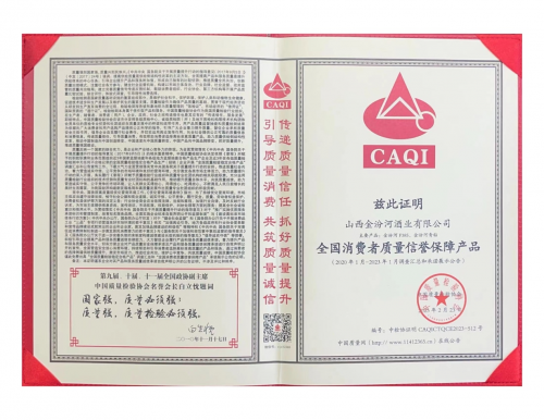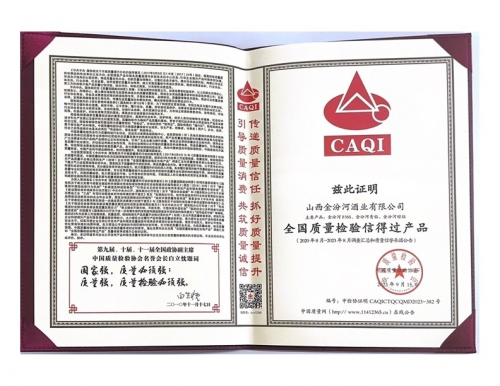 3月15日 ,中国消费者权益日,经中国质量检验协会认证,金汾河荣获“全国消费者质量信誉保障产品” “全国白酒行业质量领先企业”、“全国产品和服务质量诚信示范企业”。这一殊荣表彰了金汾河对卓越品质和专业服务的坚持。
