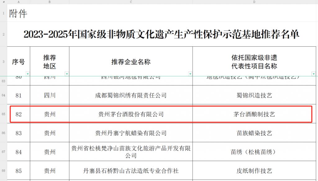 11 月 27 日,中华人民共和国文化和旅游部公示 2023-2025 年国家级非物质文化遗产生产性保护示范基地推荐名单,贵州茅台酒股份有限公司以茅台酒酿制技艺入选。