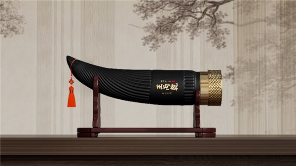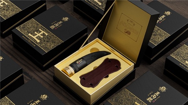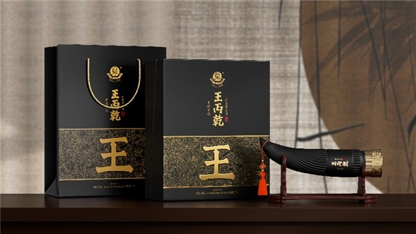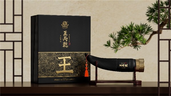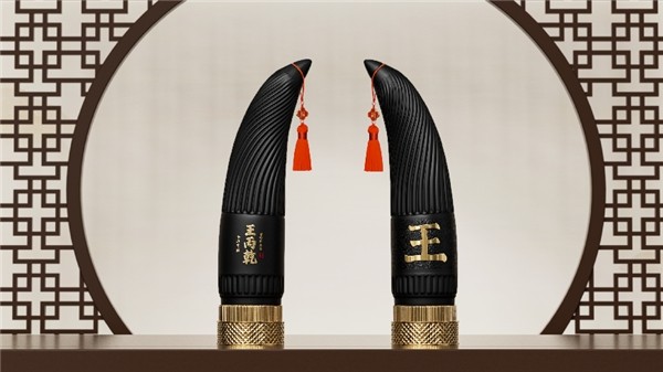 瓶身上凹凸有质的牛角纹路,则运用了螺旋设计使之独具灵动之美,入手观赏把玩质感非凡;牛角高挂的中国福结,增加了丰富的层次美感与吉祥如意、牛气冲天的美好祈愿,呈现东方典雅气质;在色彩上,尊贵黑与典雅金相辉映,彰显了尊贵奢华的品质与品味,除此之外还运用了品牌独特的设计语言,融入了“王”字超级符号,讲述了品牌的历史底蕴。