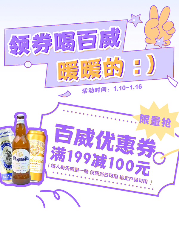 当参与饭局出现尴尬与冷场时,一杯美酒或许是解围之道。滴滴酒液入喉,温暖了身心,也舒缓了情绪,帮助人们更好地发生互动和建立联系,将无聊和压力变成了有趣和轻松,聚会也因为好酒的存在而变得更加难忘。自1月10日起至1月16日,永辉生活-咏悦汇酒库将限量发放百威品牌满199减100元优惠券(每人每天限量一张 仅限当日可用 指定产品可用 ),有福佳白啤酒330ml、科罗娜特级330ml、百威金尊听装500ml等产品参与活动,领券喝百威,乐享每一次饭局。