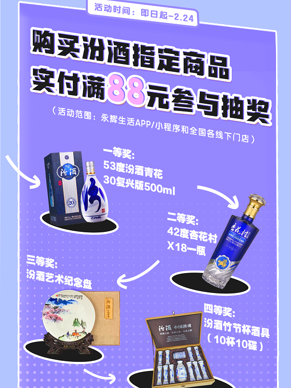 抽奖一波未完还有一波,同时间段,在永辉生活APP/小程序及全国各线下门店购买汾酒指定商品实付满88元可参加抽奖,奖品包含53度汾酒青花30复兴版500ml、42度杏花村X18一瓶、汾酒艺术纪念盘等,典雅飘香,回味悠长。
