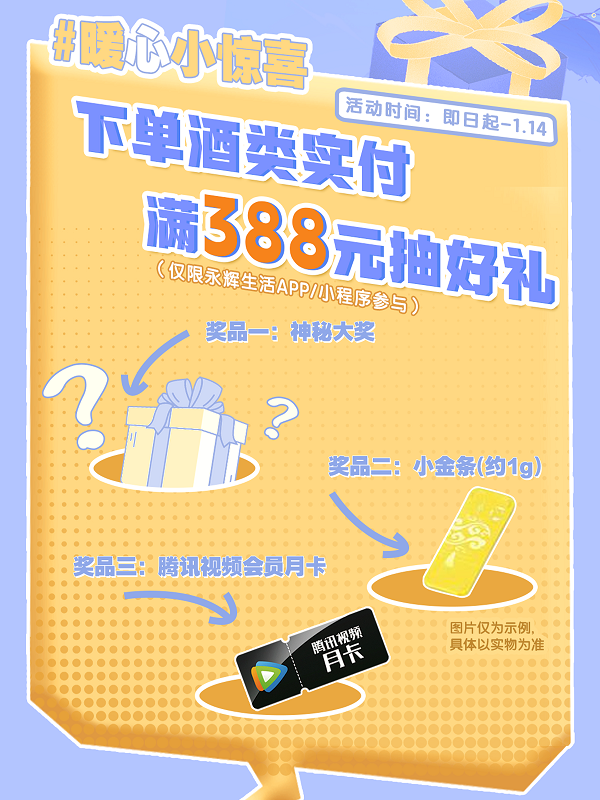 为此,自1月3日起至1月14日,永辉生活-咏悦汇酒库带来暖心惊喜,在永辉生活APP/小程序下单酒类实付满388元可抽神秘大奖,还有机会得小金条和腾讯视频会员月卡,开好酒,收获惊喜,收获美好热恋;即日起至1月25日,在永辉生活APP/小程序下单茅台指定商品满2瓶即送99元精美酒具,参与活动的产品有53度茅台王子酒(金王子)500ml、53%vol茅台1935酒 500ml、赖茅53°金樽酒500ml等,美酒盈樽,浪漫加分。