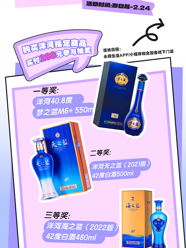 烛光随着微风的摆动而摇曳,音乐低回之间,美酒仿佛化身为爱情的使者,它在口腔中流动,点燃两颗心之间微妙的火花,将暖意与爱意传递至互有好感的两个人的身体与心灵。好酒一开,暧昧升温。茫茫人海中邂逅的概率如同中奖般的概率,爱意成双的幸运也如同中奖般的幸运,因此,永辉生活-咏悦汇酒库对应推出幸运抽奖活动,即日起至2月24日,在永辉生活APP/小程序及全国各线下门店购买洋河指定商品实付满288元可参加抽奖,奖品包含洋河40.8度梦之蓝M6+ 550ml、洋河天之蓝(2021版)42度白酒500ml、洋河海之蓝(2022版)42度白酒480ml等,柔而不寡,绵长而尾净。