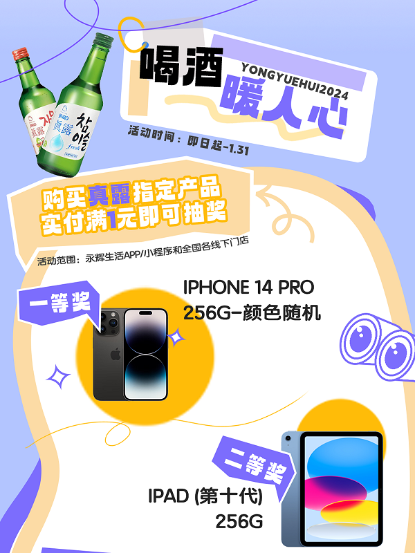 职场中一帆风顺并不常见,往往既有得意,也有失意。得意可举杯欢庆,失意亦可对饮消愁。好酒一开,无论得意还是失意,同是打工人,一同抱团取暖,分享喜忧,相互鼓励和支持,在友好和融洽的工作环境中并肩前行。即日起至1月31日,在永辉生活APP/小程序及全国各线下门店购买真露指定产品实付满1元即可抽奖,奖品包含iPhone 14 Pro 256G-颜色随机、iPad (第十代)256G、AirPods (第三代)等,一起喝真露,饱满果香,顺滑口感,微醺体验暖心职场。