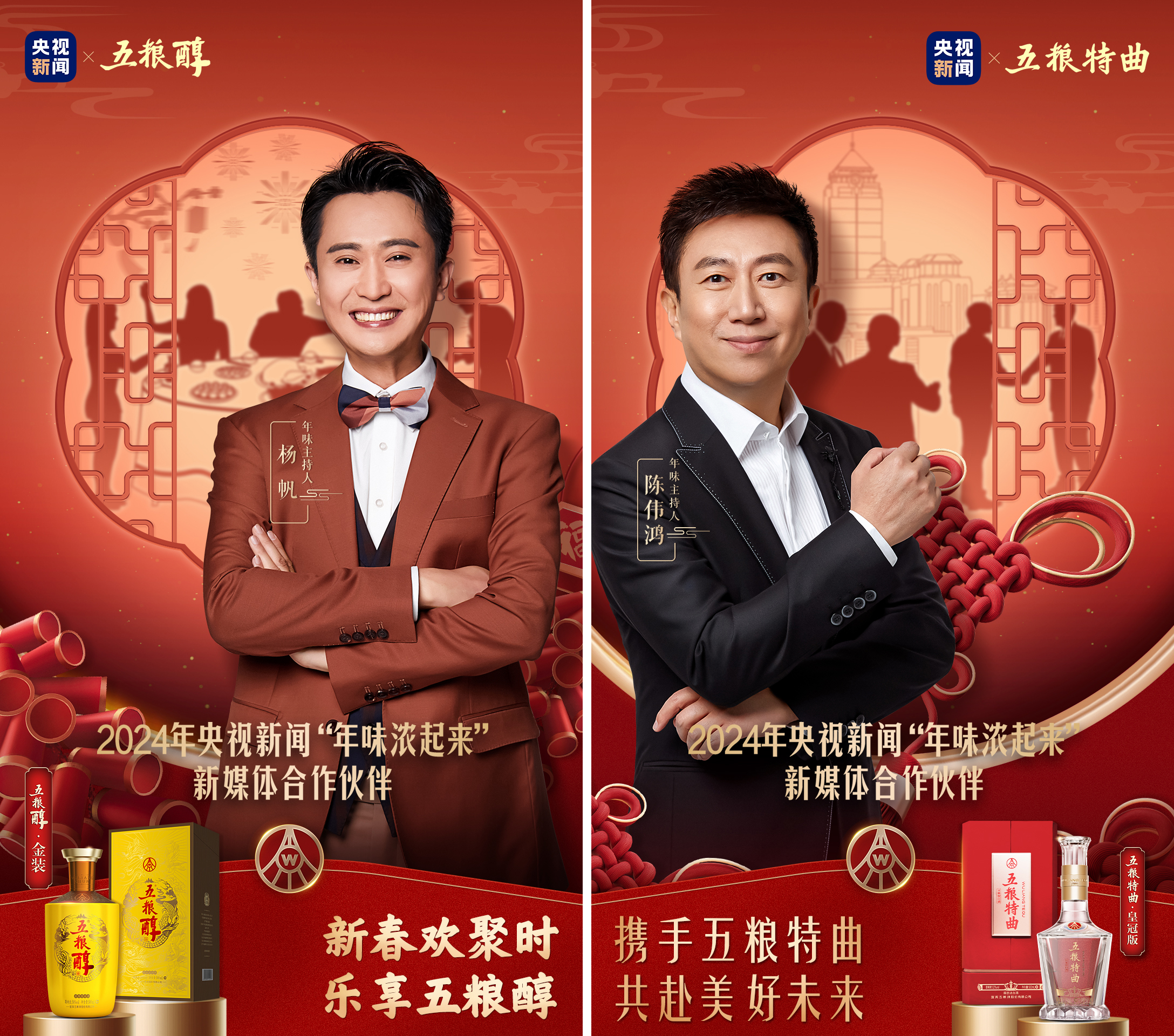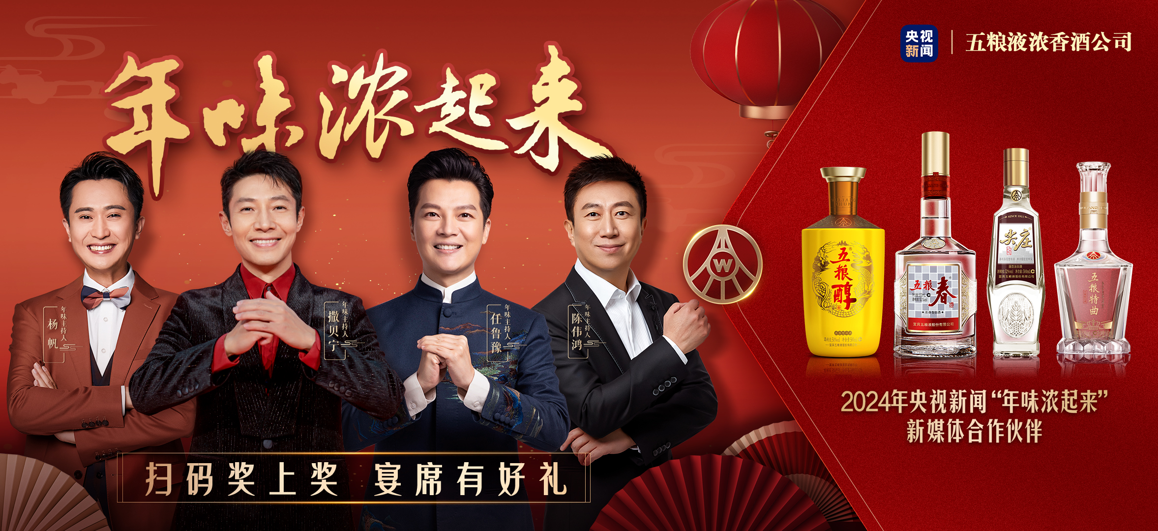 近日,2024央视新闻“年味浓起来”新媒体合作伙伴——五粮液浓香酒公司正式揭开“年味主持人”的神秘面纱,撒贝宁、任鲁豫、杨帆、陈伟鸿分别阐释五粮春、尖庄、五粮醇、五粮特曲的品牌精神,让年味“浓上加浓”。