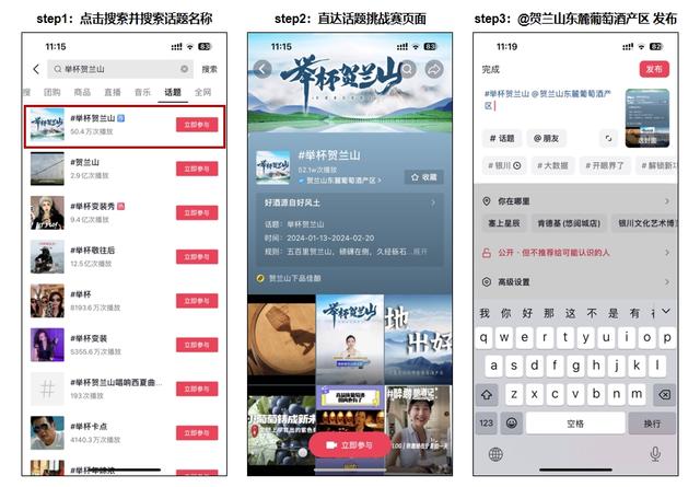 本次活动联动本地酒庄、酒企、媒体、网络达人,面向全国用户发起“举杯贺兰山”邀约,通过话题挑战赛、葡萄酒众测、酒庄探访、达人互动、全民任务、趣味贴纸、主题直播等丰富多彩的内容和形式,全面推介宁夏贺兰山东麓葡萄酒产区品牌,增加传播触点,进一步提升目标消费市场用户品牌感知,围绕品效销合一,拉动葡萄酒线上销售增长。广大网友可以通过在抖音App搜索“举杯贺兰山”便可直达话题挑战赛页面,拍摄视频同时@贺兰山东麓葡萄酒产区发布,即可参与其中。(中国日报宁夏记者站 胡冬梅)