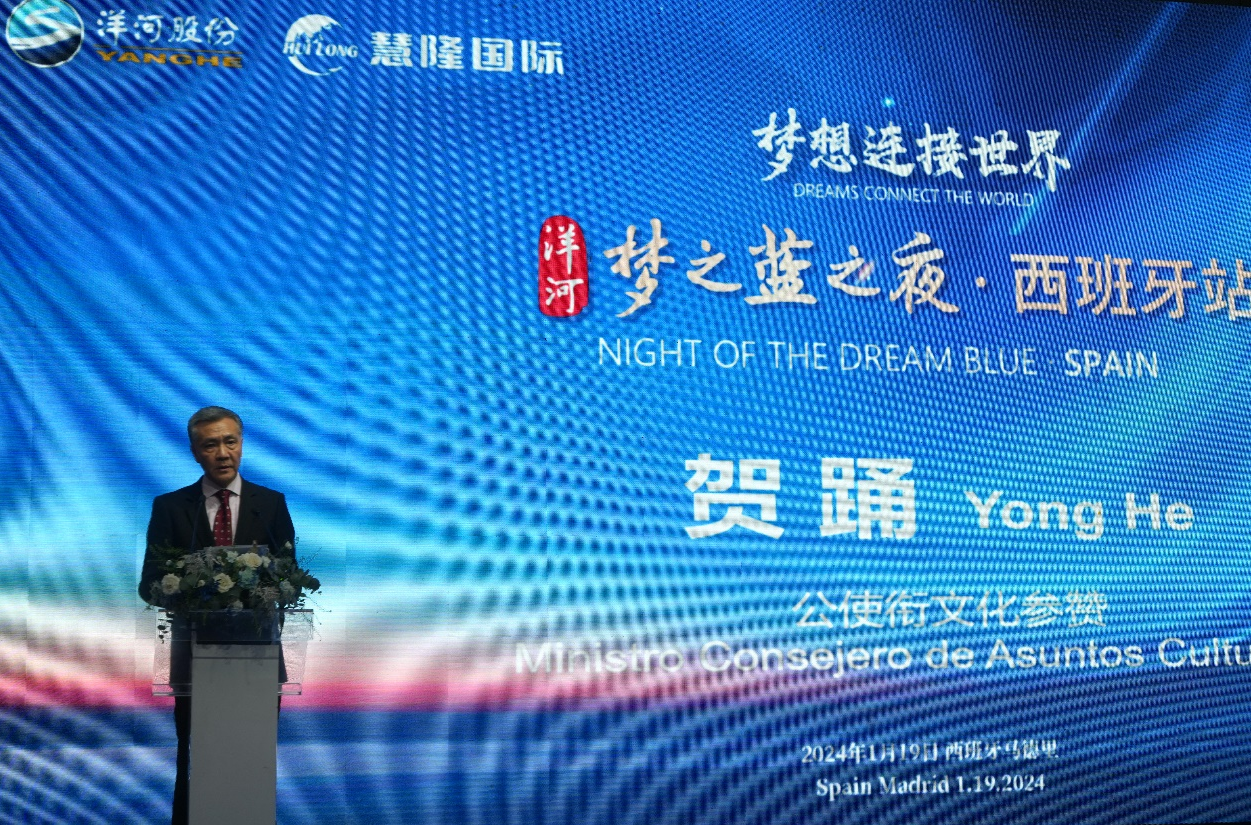 西班牙时间1月19日晚,梦想连接世界·洋河“梦之蓝之夜”在西班牙马德里举办。中国驻西班牙大使馆公使衔文化参赞贺踊先生,西班牙国家关系司司长José Francisco,马德里中国文化中心主任兼中国驻马德里旅游办事处主任杨长青女士,西班牙外交世界协会主席 amasada先生,西班牙知名侨领、西班牙和平统一促进会主席徐松华先生, Moncloa aravaca区议会主席Borja先生,慧隆国际贸易有限公司董事长、西班牙华侨华人商业联合会会长陈慧先生,以及西班牙经销商代表高朋满座,洋河股份党委书记、董事长张联东出席活动晚宴,与在场嘉宾共同开启了一场文化交流之旅。