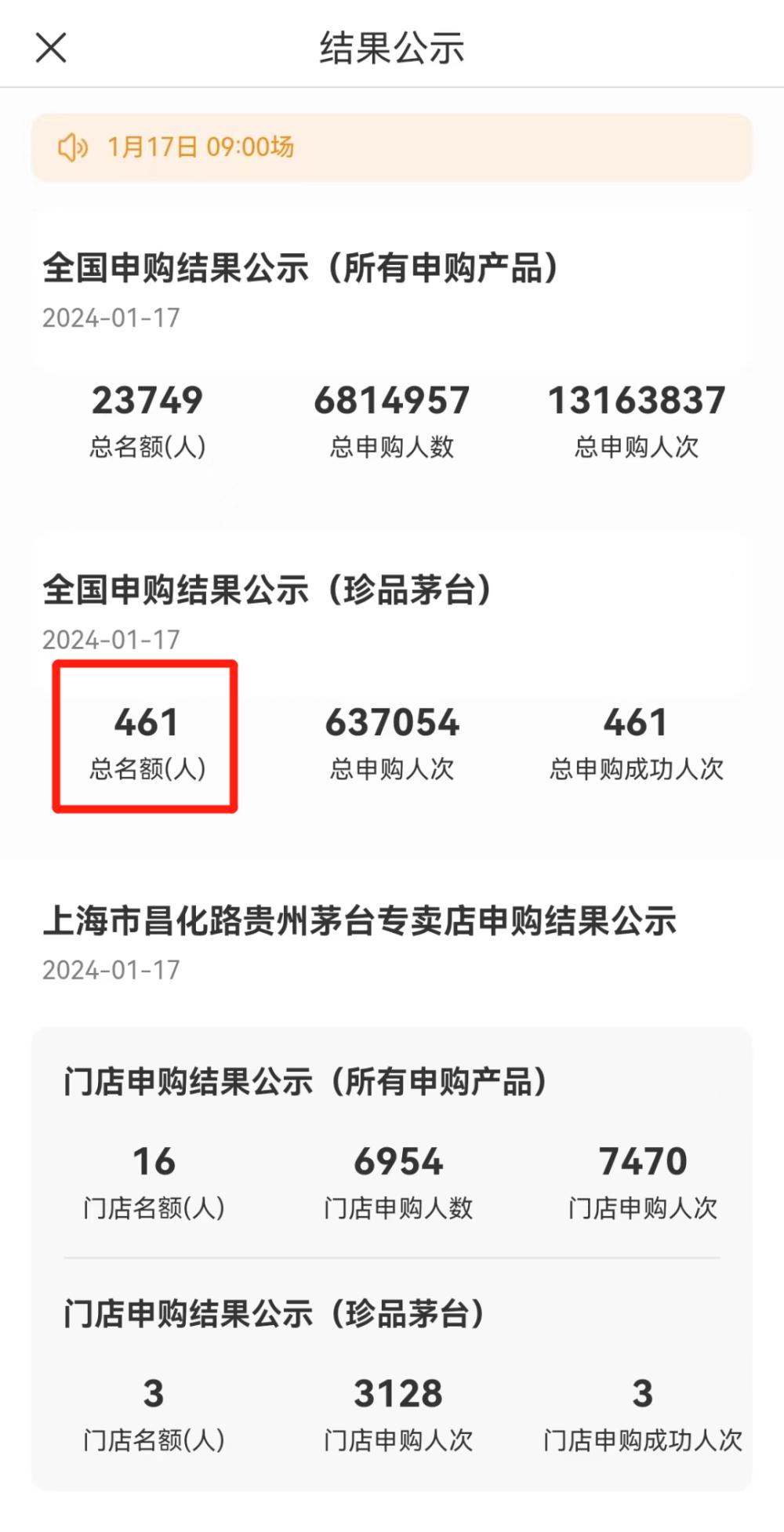 以记者申购的 53%vol500ml 贵州茅台酒(珍品)为例,申购结果显示,当天共有 63 万人申购该品,申购成功者仅 461 人,申购成功率为 0.07%;在记者申购的位于上海普陀的某茅台专卖店里,共有超 3000 人参与申购,申购成功者仅 3 人,申购成功率仅 0.09%。申购数据由杭州互联网公证处公证公示。
